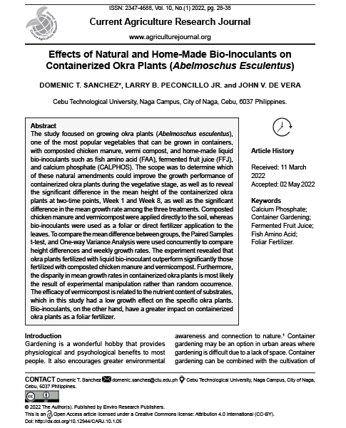 The study focused on growing okra plants (Abelmoschus esculentus), one of the most popular vegetables that can be grown in containers, with composted chicken manure, vermi compost, and home-made liquid bio-inoculants such as fish amino acid (FAA), fermented fruit juice (FFJ), and calcium phosphate (CALPHOS). The scope was to determine which of these natural amendments could improve the growth performance of containerized okra plants during the vegetative stage, as well as to reveal the significant difference in the mean height of the containerized okra plants at two-time points, Week 1 and Week 8, as well as the significant difference in the mean growth rate among the three treatments. Composted chicken manure and vermicompost were applied directly to the soil, whereas bio-inoculants were used as a foliar or direct fertilizer application to the leaves. To compare the mean difference between groups, the Paired Samples t-test, and One-way Variance Analysis were used concurrently to compare height differences and weekly growth rates. The experiment revealed that okra plants fertilized with liquid bio-inoculant outperform significantly those fertilized with composted chicken manure and vermicompost. Furthermore, the disparity in mean growth rates in containerized okra plants is most likely the result of experimental manipulation rather than random occurrence. The efficacy of vermicompost is related to the nutrient content of substrates, which in this study had a low growth effect on the specific okra plants. Bio-inoculants, on the other hand, have a greater impact on containerized okra plants as a foliar fertilizer.